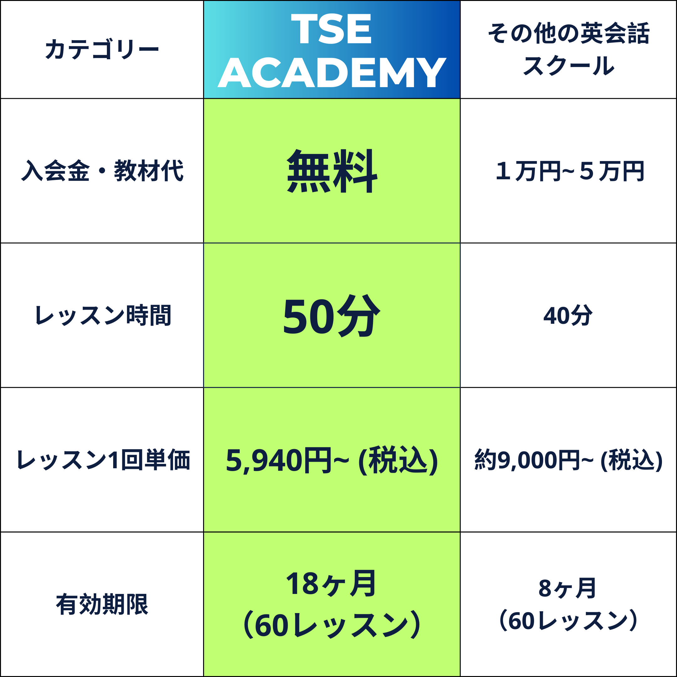 “Live as if you were to die tomorrow. Learn as if you were to live forever.”Mahatma Gandhi コース料金 入会金無料 教材代無料 Why TSE ACADEMY? コースの時間 マンツーマンレギュラーコース 料金 マンツーマンデイタイム・オンラインコース料金 プライベートグループレギュラーコース料金 プライベートグループデイタイム・オンラインコース料金 アクセス